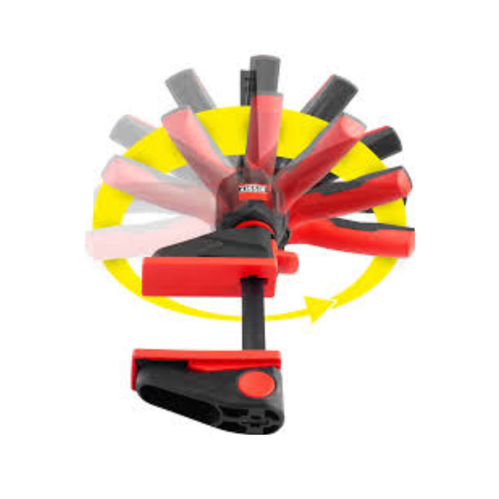 Ce serre-joint innovant, en instance de brevet, permet à la poignée de tourner à 360° autour du rail.
