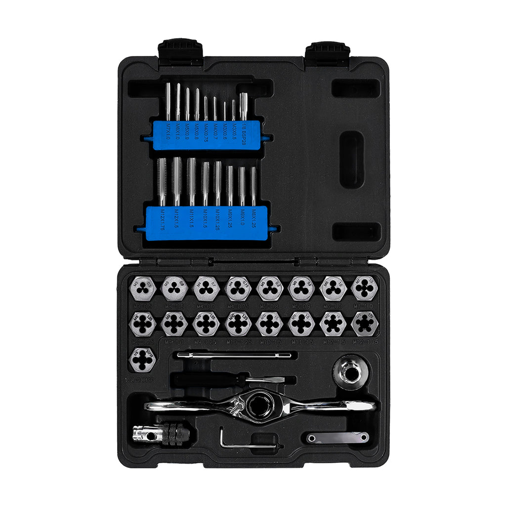 Comprend 17 tarauds, 17 matrices, une clé, un support de taraud, un support de matrice hexagonal, une poignée en T, une jauge de pas de filetage, un tournevis, une clé hexagonale.
