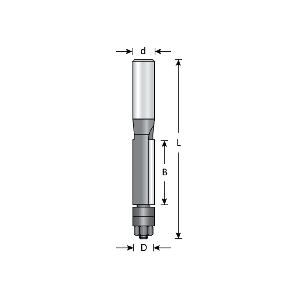 Cette mèche à affleurer avec roulement à billes est recommandée pour les travaux de gabarit ou de patronage où la pièce est extrêmement solide. Deux flûtes sont idéales lorsqu'une finition fine est une priorité.