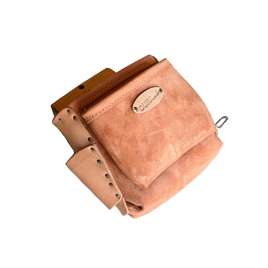 Sac avec deux grandes poches rivetées, un support à marteau ou couteau et une porte cisaille. Le rabat est fabriqué à partir de cuir de ceinture ultra résistant.