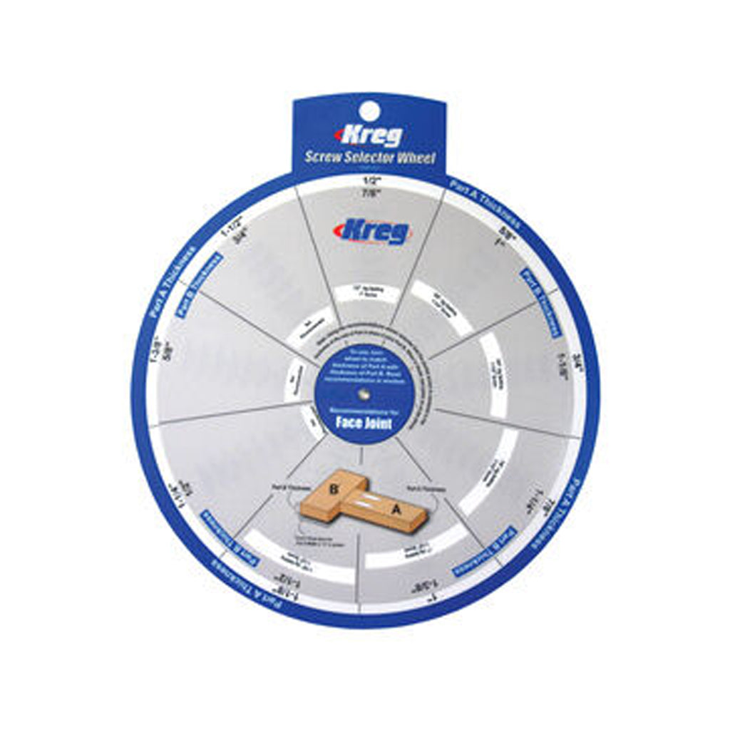 La roue de sélection à vis facilite plus que jamais la construction de projets avec Kreg Joinery. Il suffit de composer l’épaisseur de chaque pièce à assembler - que ces épaisseurs soient les mêmes ou différentes - et la roue vous indique la longueur de vis correcte et le réglage Kreg Pocket-Hole Jig.