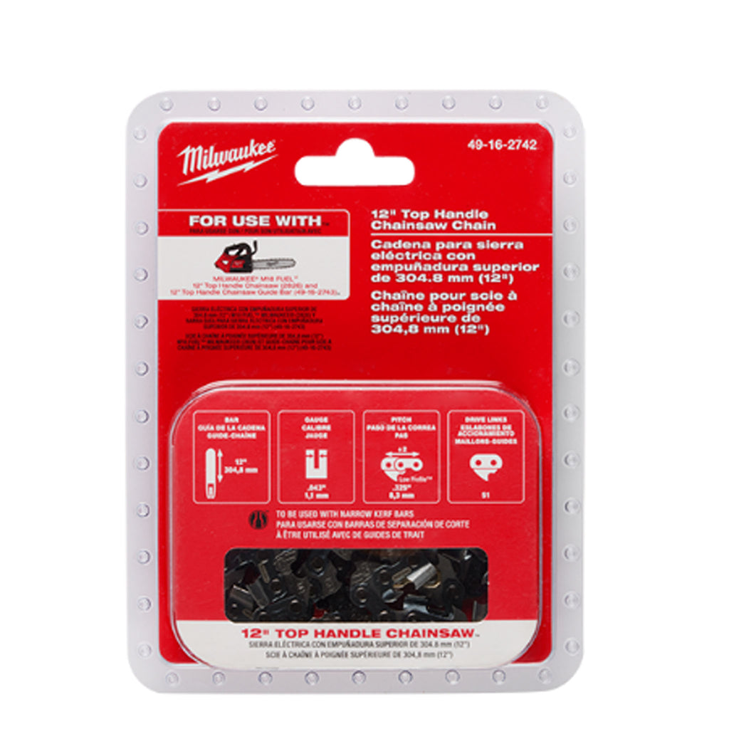 La chaîne de tronçonneuse à poignée supérieure de 12 po est à utiliser avec la scie à chaîne à poignée supérieure Milwaukee® M18 FUEL™ de 12 po (2826-20C) et le guide-chaîne de tronçonneuse à poignée supérieure de 12 po (49-16-2743). La conception optimisée de la chaîne de tronçonneuse maximise efficacité et offre une qualité de coupe supérieure avec de faibles vibrations et un recul minimal. La conception durable de la chaîne reste affûtée dans des conditions difficiles et est construite avec un alliage d'acier à haute résistance pour une résistance aux intempéries et une durée de vie accrue.