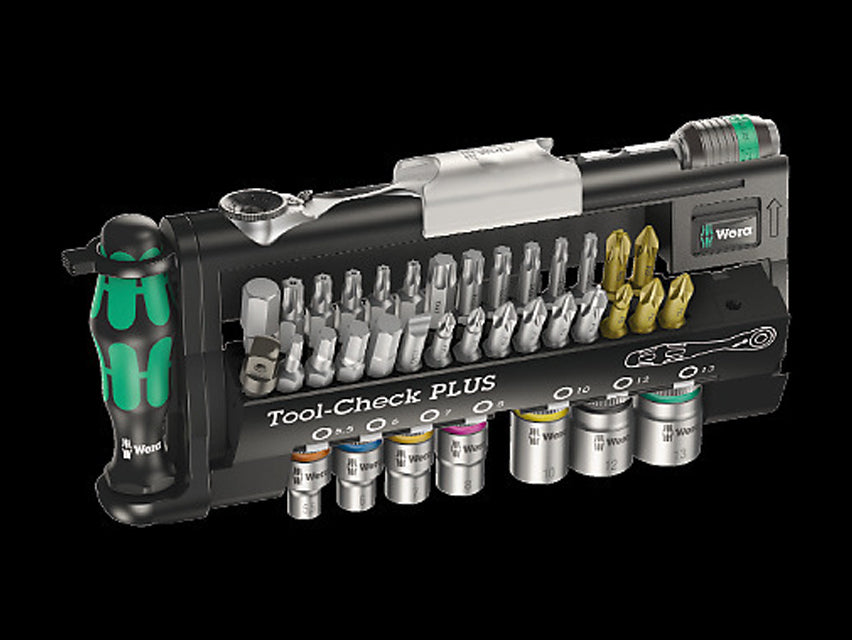 L'ensemble de clé à criquet comprend des embouts, des douilles et un support dans un minimum d'espace.