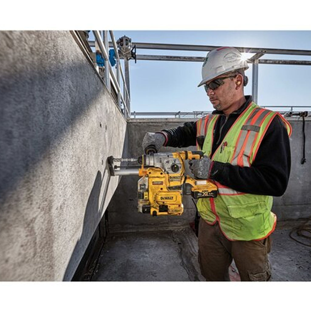 Le marteau perforateur rotatif sans balais de 1 1/8 po 20 V MAX* XR est une perceuse performante alimentée par un moteur sans balais et un mécanisme de conception allemande durable produisant 3,5 joules d’énergie à l’impact. Sa légèreté en fait le marteau perforateur rotatif idéal pour relier les éléments structurels, ancrer les poutres et les colonnes, suspendre des tringles ainsi que fixer des accessoires de protection sismique et de sécurité, des chemins de câbles, des entretoises et des montants en acier. Outil de la gamme PERFORM & PROTECT, il intègre le système d’embrayage électronique antirotation E-CLUTCH et le SYSTÈME ACTIF DE CONTRÔLE DES VIBRATIONS SHOCKS. Le système E-CLUTCH protège l’utilisateur en cas de grippage en arrêtant la rotation de la mèche. Le système SHOCKS réduit les vibrations ressenties par l’utilisateur aux poignées, comparativement aux marteaux perforateurs rotatifs sans cette fonction. Ce marteau devient conforme au tableau 1 de l’OSHA lorsqu’il est utilisé avec l’extracteur intégré DWH304DH.