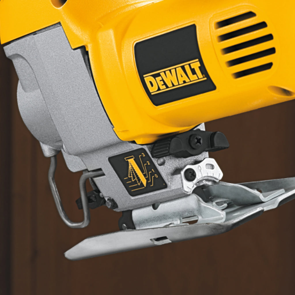 La scie sauteuse DW317K est dotée d'un puissant moteur de 5,5 A à vitesse variable pour fournir jusqu'à 3100 coups par minute. L'action orbitale à 4 positions permet des coupes plus rapides et plus agressives. Un serre-lame sans clé permet de changer les lames rapidement et facilement et les crans de biseau à 0 ° et 45 ° permettent d'assurer un biseautage précis.