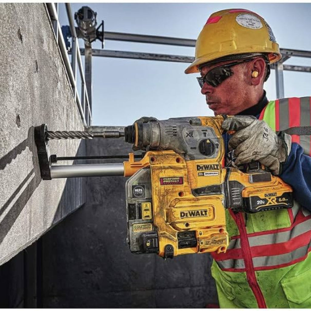 Cet extracteur de poussière conforme au tableau 1 de l’OSHA fonctionne avec les marteaux perforateurs rotatifs sans fil DCH293 et D25333 de 1 1/8 po. Il comporte un ensemble de boîte à poussière conforme à la norme OSHA 1926.1153. Avec un mécanisme de nettoyage du filtre et un filtre HEPA, elle élimine 99,97 % des particules de 0,3 micron ou plus dans l’air. Cet extracteur de poussière est doté d’un puissant ventilateur qui augmente la succion pendant le perçage à haut rendement. Il permet de percer jusqu’à 1 po de diamètre et jusqu’à 10 po de profondeur. Installez des gaines, des goujons/coins et des ancrages à vis de grand diamètre à l’aide de notre extracteur de poussière intégré.