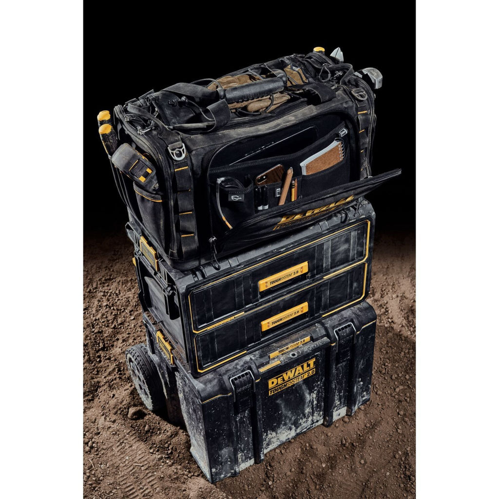 Bénéficiez d'un rangement vertical spacieux avec le sac à outils de chantier TOUGHSYSTEM® 2.0. Ce sac comporte plus de 50 poches et un cordon élastique supérieur qui permet le stockage vertical de gros outils électriques, d'outils manuels et d'autres nécessités du chantier. Le sac à outils de chantier est accessible de n'importe quel côté pour un maximum de commodité. Le tissu 1680D durable, le matériau anti-salissure et la base imperméable rendent ce sac adapté à tout environnement de travail. Le sac peut être empilé avec n’importe quel produit TOUGHSYSTEM 2.0.