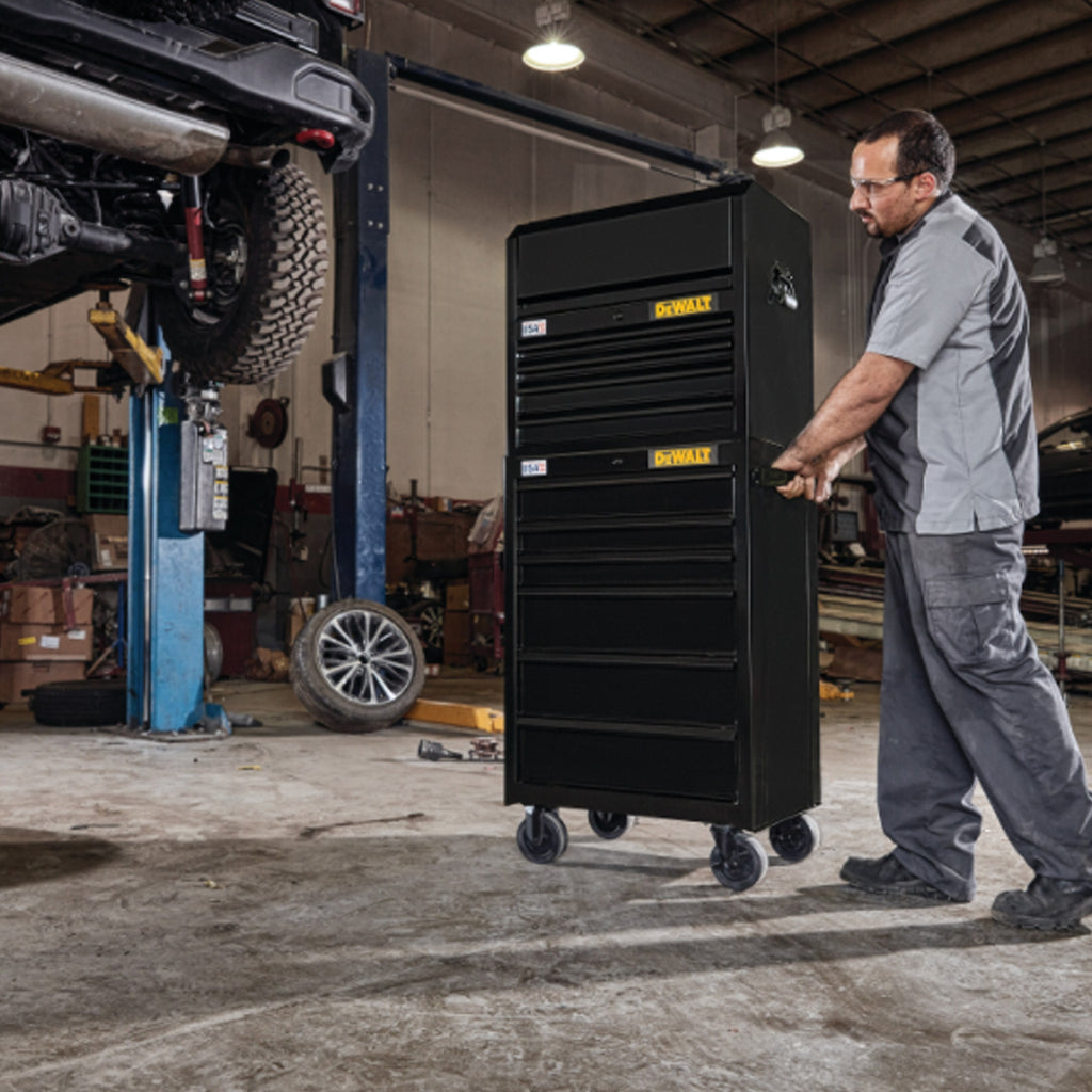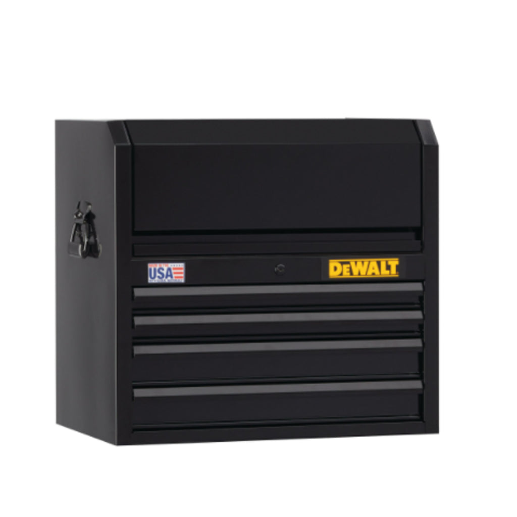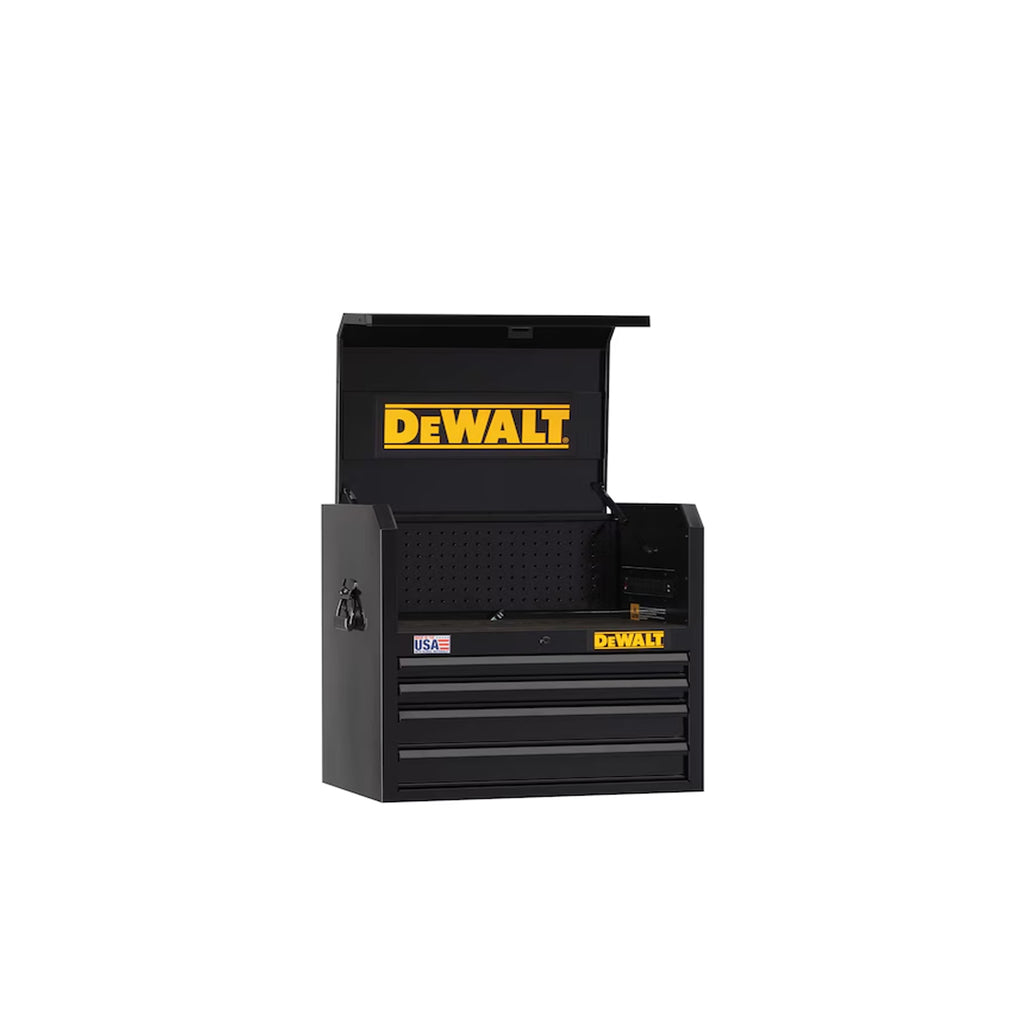 Ce coffre à outils à quatre tiroirs de 26 po de large est fait d’acier à double paroi qui lui assure solidité et durabilité. D’une capacité de charge de 100 lb, ses quatre tiroirs pleine extension sont dotés de roulement à billes et d’un loquet de fermeture feutré, pour un fonctionnement fluide et silencieux. Elle compte en outre un dispositif robuste de verrouillage interne à clé pour protéger votre matériel. Sous le couvercle à double vérin au gaz – pour une opération tout en douceur –, l’espace de travail présente des ports pratiques pour recharger vos outils, batteries et autres appareils électroniques. Les tiroirs ainsi que le plateau supérieur sont dotés de tapis de protection marqués en relief du logo DEWALT. Ce modèle se combine à merveille avec notre armoire à outils sur roues à 6 tiroirs de 26 po de la série 700 (DWST22760, vendue séparément). Ne cherchez pas ailleurs, notre gamme de systèmes métalliques de rangement d’outils répond à tous vos besoins en rangement d’outils et en organisation. Choisissez parmi une variété de coffres à outils et d’armoires sur roues de première qualité, tous fabriqués en acier de calibre 18/20. Tous les modèles sont profonds de 18 po pour y accueillir nos ensembles d’outils de mécanicien, ainsi que vos outils manuels et autres accessoires.