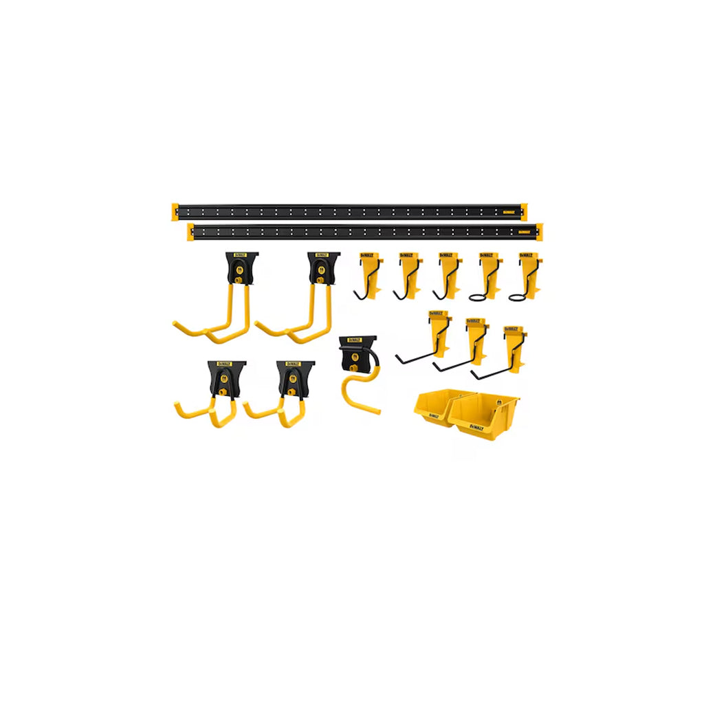 La trousse de démarrage pour accessoires DEWALT (21 pces) est un excellent moyen de commencer à ranger votre atelier! Elle comprend deux rails métalliques DEWALT de 48 po d’une capacité de charge de 100 lb. par pied. Elle comprend également une variété d’accessoires de rangement d’atelier DEWALT, tels que 2 crochets standard courts, 2 crochets standard longs, 1 crochet à outil à long manche, 8 crochets à outil manuel et 2 bacs de rangement en plastique. Tous les accessoires peuvent être facilement fixés aux rails métalliques DEWALT et sont dotés d’un système de verrouillage breveté qui bloque le crochet sur le rail.