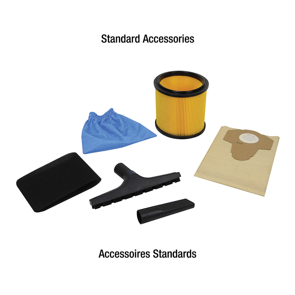 Comprend boyau souple de 6 pi. X 1-1/4'', rallonge de 2 mcx, sac de poussière de 30L, filtre en mousse, filtre réutilisable, embout tout usage de 10'' et embout en bec