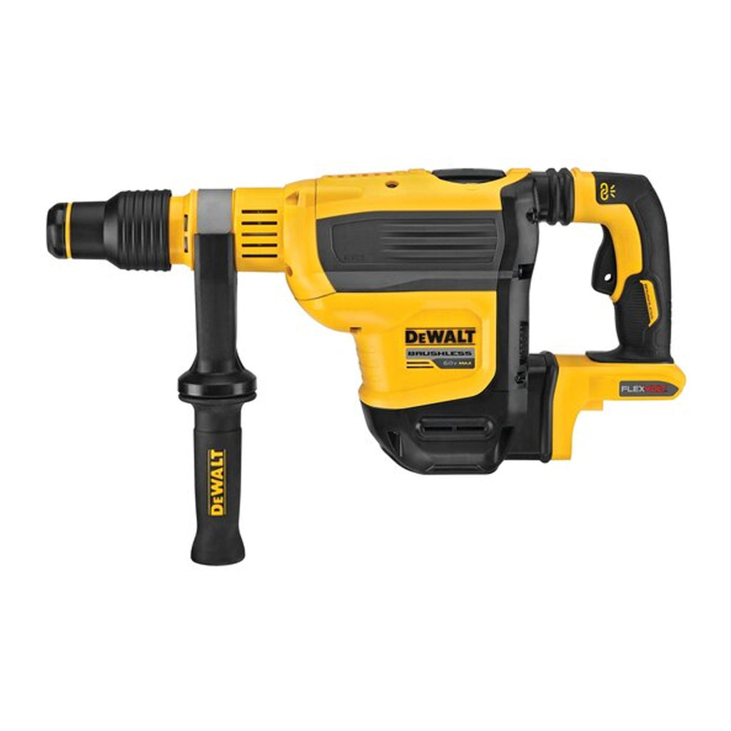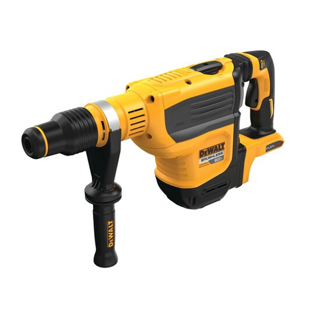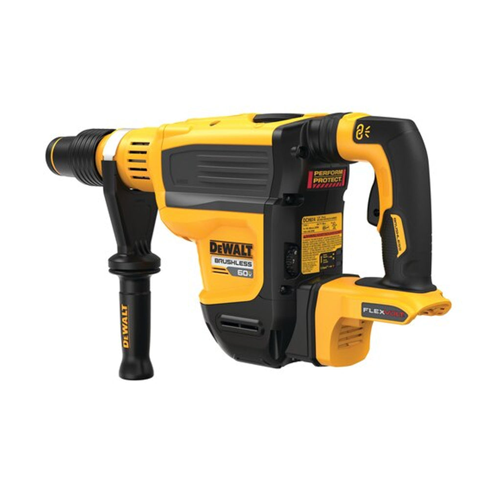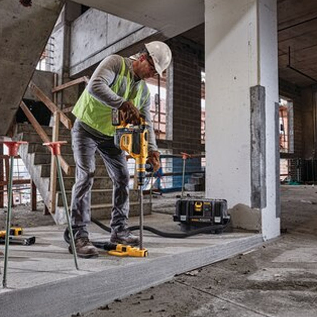 Le marteau perforateur combiné de 1 3/4 po SDS Max 60 V MAX* est un marteau de poids moyen à haut rendement alimenté par un moteur sans balais des mécanismes de conception allemande durables. Il génère 10,5 joules d’énergie à l’impact pour des perçages et des ébréchages rapides, même dans le béton le plus dur. L’électronique à vitesse constante permet à l’outil de maintenir sa vitesse sous charge, tandis que le système breveté E-CLUTCHMD protège l’utilisateur dans les situations de grippage en arrêtant la rotation du foret. Son poids moyen convient parfaitement pour le perçage horizontal à haut rendement, le perçage horizontal en série pour l’installation de barres d’armature no 5 à 8, le carottage à sec jusqu’à 4 po, l’ébréchage dans n’importe quel type de mur supérieur à inférieur ainsi que le nivellement. Le système SHOCKS-Active Vibration Control® réduit les vibrations ressenties par l’utilisateur aux poignées, comparativement aux marteaux perforateurs rotatifs sans cette fonction. Il est doté du dispositif WIRELESS TOOL CONTROLMC qui permet à l’utilisateur de relier l’outil à l’extracteur de poussière 60 V MAX* DCV585 pour l’activer à distance. Cet outil est muni du système Tag ReadyMC permettant aux utilisateurs et aux entreprises d’apposer une étiquette DEWALT TagMC à l’outil afin de faire le suivi de son emplacement au moyen de l’application Tool ConnectMC.