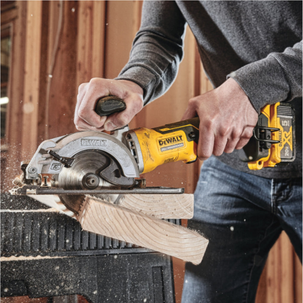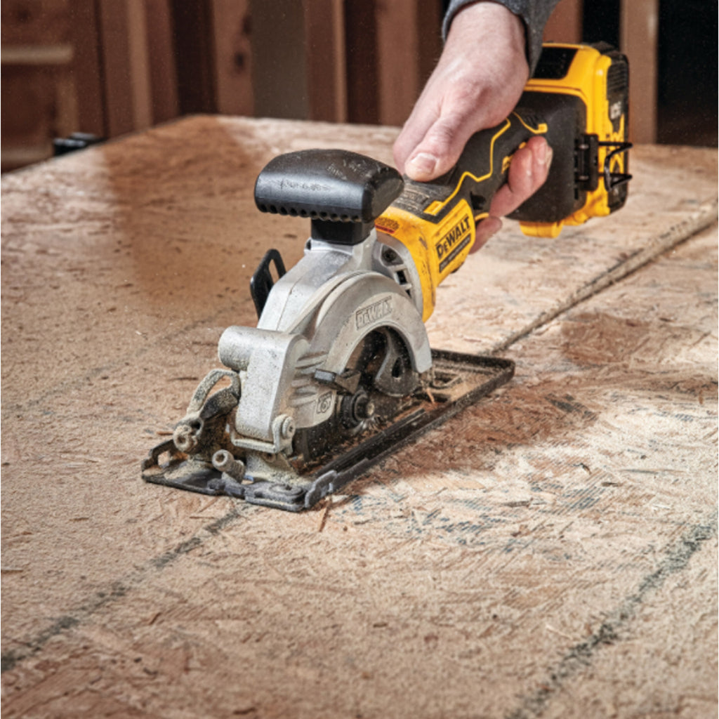 Cet ensemble de scie circulaire sans fil et sans balais de 4 1/2 po comprend une batterie 20 V MAX* de 5,0 Ah, un chargeur, une lame, un guide longitudinal, un adaptateur pour prise d’évacuation de la poussière et un sac à outils. La scie circulaire sans fil DCS571 est dotée d’un engrenage conique permettant aux utilisateurs de couper deux épaisseurs de matériaux à 90 degrés et une épaisse de matériaux à 45 degrés. Le compartiment de rangement intégré de clé pour lame facilite le changement de lame pour l’utilisateur. La poignée allongée optimise la portée pour les tâches de refente de panneaux OSB et de contreplaqué. La batterie DCB205 permet de couper jusqu’à 369 pieds linéaires de panneaux OSB de 3/4 po.