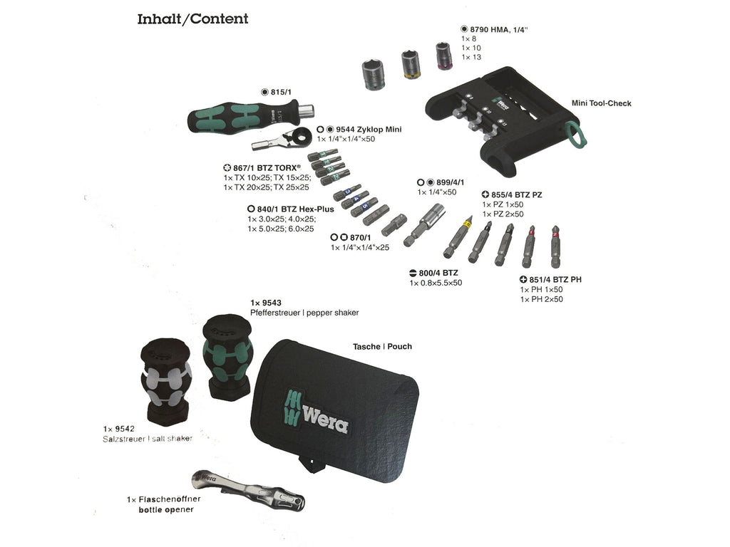 Le père Noël aussi est content quand sa hotte prend moins de place. Il se réjouira donc particulièrement du contenu du calendrier de l'avent Wera 2024. Ce calendrier contient plusieurs nouveautés mondiales qui présentent différents avantages. 8 embouts de 25 mm de long, 5 embouts de 50 mm de long, 3 douilles avec emmanchement 1/4'', 1 porte-embouts universel et - tenez-vous bien - une tête de cliquet Zyklop Mini pour embouts (et aussi pour les douilles avec un adaptateur). On notera les embouts BiTorsion particulièrement durables. Cette collection d'outils associée au porte-embouts avec manche Kraftform permet d'utiliser beaucoup de vis et écrous différents. Et même avec un angle de reprise de seulement 6° grâce au Zyklop Mini avec son cliquet à fine denture, l'inversion droite/gauche est incluse. Les bricoleurs peuvent choisir s'ils préfèrent travailler avec un cliquet ou un tournevis. L'assortiment est rangé dans un boîtier qui rappelle fortement le si populaire et si pratique Tool-Check, mais en beaucoup plus compact. Le design original Wera de la salière et de la poivrière plaira aux gourmets qui aiment un supplément d'assaisonnement, à la maison ou en déplacement. Un incontournable pour tous les fans, disponible uniquement dans le calendrier de l'avent. Pour profiter de la pause comme il se doit, il faut bien sûr aussi un décapsuleur au format compact Zyklop Mini qui constitue aussi un très beau souvenir Wera. Ces 3 nouveaux compagnons du quotidien sont rangés dans un étui pour faciliter le transport et éviter que le sel et le poivre ne s'échappent dans le sac.