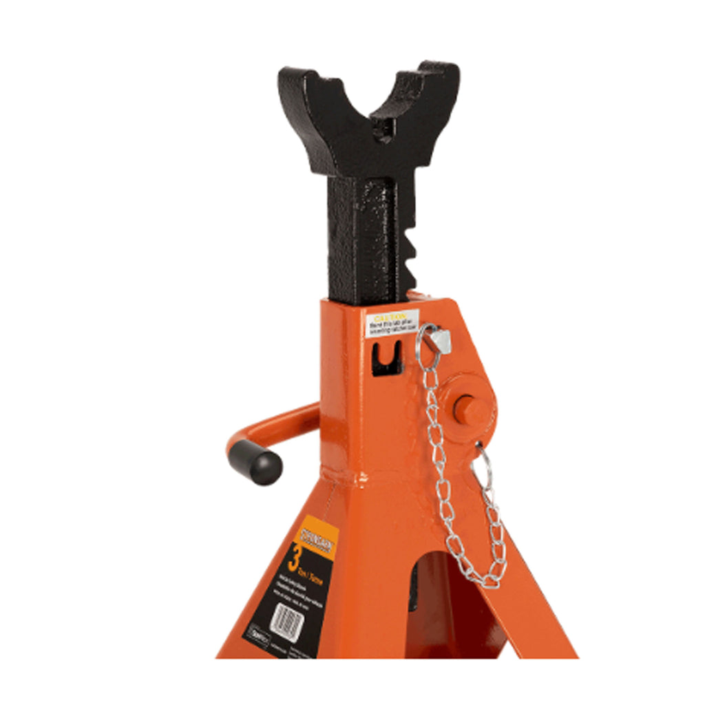 Utilisés pour soutenir les véhicules après les avoir soulevés ces chandelles à cliquet sont dotés d'une colonne de support en fonte ductile avec des dents de crémaillère pour un réglage de la hauteur d'un mécanisme à double verrouillage pour la sécurité de selles crantées pour les véhicules unifiés et de pieds soudés pour éviter l'enfoncement. Vendus par paire.