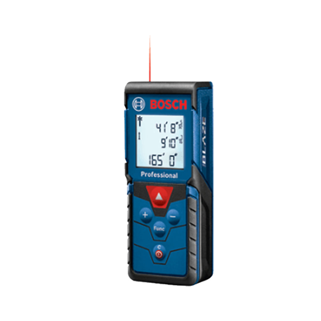 Le télémètre laser Bosch de 165 pi BLAZE™ Pro GLM165-40 est un outil très complet simple à utiliser. Doté d’un écran rétro-éclairé à lecture facile qui éclaire les valeurs de mesure, il intègre des fonctions de mesure de distances, de mesure de distances, superficies, volumes et de mesure indirecte. Il dispose par ailleurs d’une mémoire pour 10 mesures. Sa fonction addition/soustraction permet à l’utilisateur d’ajouter ou de soustraire des valeurs mesurées. Le BLAZE™ Pro inclut un mode de mesure en temps réel (mode par défaut) consistant à actualiser automatiquement l’affichage de distance à mesure que le télémètre se rapproche ou s’éloigne de la cible. Il dispose d’une technologie laser de précision et d’un mode de mesure en temps réel permettant d’effectuer des mesures rapides et fiables jusqu’à une portée de 165 pi pour estimer en quelques secondes le travail à effectuer. Sa précision est de ± 1/16 po. Il tient dans les poches, ce qui permet de l’avoir toujours à portée de main.