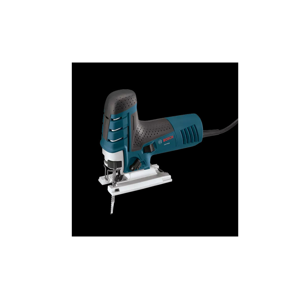 La scie sauteuse à poignée en pommeau Bosch JS470EB offre une précision de coupe inégalée. Les menuisiers et les installateurs de cuisines et de salles de bains apprécieront le meilleur moteur de sa catégorie de 7,0 A et sa commande à vitesse variable, faisant de cette scie un excellent choix pour la coupe en courbe. Elle offre de 500 à 3 100 courses/minute : avec une longueur de course de 1 po. Son corps est ergonomique avec une poignée de prise souple avant pour assurer confort et contrôle à l’utilisateur. Elle dispose d’un carter d’engrenages en aluminium. Ce mécanisme entièrement équilibré à faible vibration est doté d’une conception en plongée pour des vibrations faibles et d’une électronique Constant Response qui permettent de maintenir une vitesse constante en conditions de charge. Elle est équipée d’une grande plaque d’assise en aluminium moulé avec un recouvrement du sabot en plastique ne laissant pas de marque. La fixation de la lame multidirectionnelle de la JS470EB offre une prise supérieure à celle des lames à tige en T (mais elle n’est pas compatible avec les lames à tige en U). Une molette de réglage de vitesse permet de présélectionner la vitesse de fonctionnement. Le levier d’éjection de la lame permet d’éviter de toucher la lame chaude. Un dispositif soufflant anti-poussière garantit une visibilité optimale de la ligne de coupe.