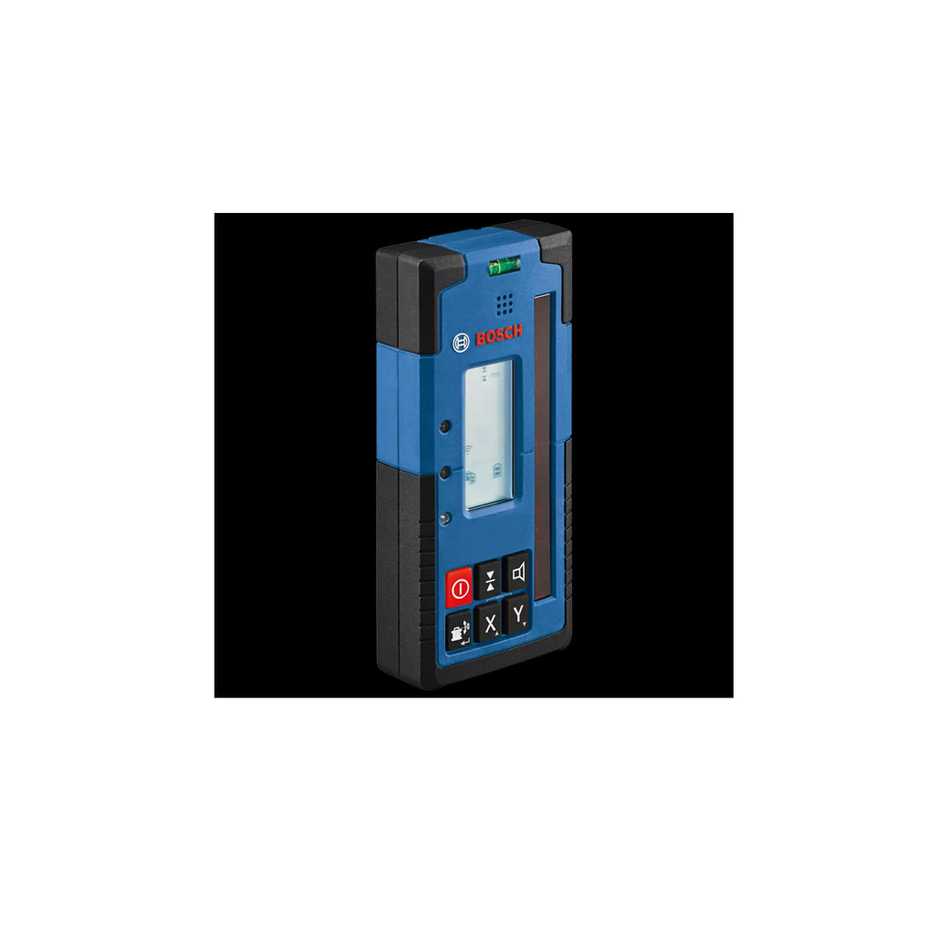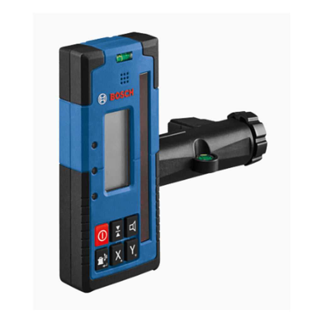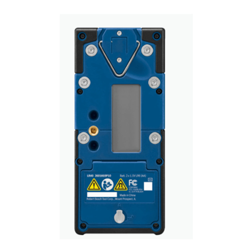 La cellule de réception LR40 Bosch est conçue pour augmenter la portée des lasers rotatifs GRL4000-80CH et GRL4000-80CHV et permettre une détection jusqu’à 2 000 pi de distance. Elle est dotée de deux écrans LCD rétro-éclairés (un sur chaque face) pour une utilisation dans les endroits sombres et à l’extérieur. Elle dispose de boutons « axe X » et « axe Y » permettant des calculs d’élévation et de déblai ou remblai suivant les deux axes jusqu’à un angle de ± 8,5°. L’écran comporte de nombreux affichages faciles à lire, notamment des affichages de direction (flèches vers le haut/vers le bas), un affichage ligne de centrage, un affichage niveau de précision, un affichage niveau des piles et un affichage signal audio. Il possède aussi des DEL assurant une lecture facile et une utilisation simple. La très grande zone de détection laser aide à trouver le faisceau laser très rapidement et facilite de ce fait les mises à niveau. La cellule de réception intègre également des aimants offrant une bonne adhérence sur les surfaces en métal, un haut-parleur réglable, un niveau à bulle, un crochet de fixation et un revêtement caoutchouté ergonomique pour un maximum de confort.