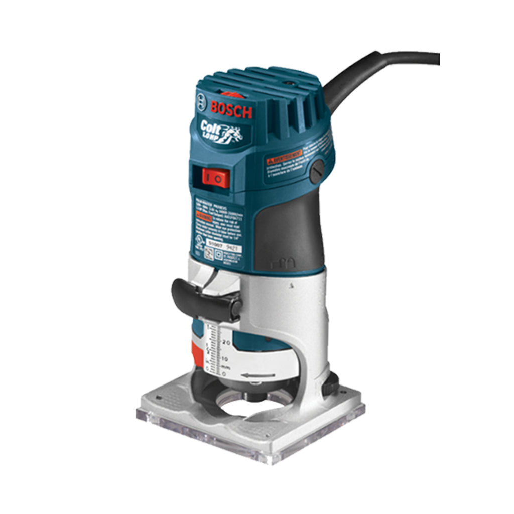 La toupie portative à vitesse variable Colt PR20EVS de Bosch est un outil de petite taille qui combine puissance, précision et polyvalence. Elle possède un moteur 1,0 HP de 5,6 A qui tourne à une vitesse variable de 16 000 à 35 000 tr/min. La molette de présélection de vitesse est judicieusement placée au-dessus de l’outil. La toupie est équipée d’une électronique Constant Response qui détecte les sollicitations de charge importantes et augmente alors la puissance afin de maintenir le régime constant à la valeur sélectionnée. Elle dispose d’une électronique de démarrage en douceur, ce qui réduit le couple de démarrage. Le réglage de la profondeur est par ailleurs très simple ; il suffit d’aligner et d’abaisser le moteur puis de bloquer la toupie en position à l’aide du levier de blocage. Les réglages micrométriques sont tout aussi faciles, grâce à la roulette se trouvant sur la base arrière de la toupie. Elle accepte les fraises standard avec queue de 1/4 po pour un maximum de flexibilité et avec diamètre de coupe jusqu’à 1-5/16 po. Le carter du moteur permet une utilisation confortable grâce à sa poignée en caoutchouc surmoulé qui épouse la forme de la main. La base fixe en aluminium robuste incluse est durable, solide et précise.