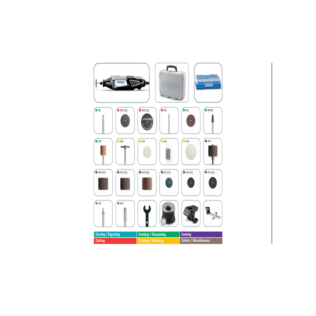 Tout faire avec un seul et même outil. Une maîtrise parfaite des projets est indispensable pour obtenir des résultats adéquats. Avec ses accessoires et ses adaptations interchangeables, le Dremel 4000 comblera toutes vos attentes en matière de performances et de précision. L'outil est doté d'une poignée souple à 360 degrés pour une plus grande maniabilité et un plus grand confort dans toutes les positions. Il permet de travailler avec grande précision même dans les recoins et endroits difficiles d’accès. Avec un variateur de vitesse variable de 5000 à 35000 et un commutateur marche/arrêt séparé, vous pourrez toujours reprendre votre projet exactement là où vous l'avez laissé. La régulation électronique associée au moteur haute performance vous permet de toujours disposer de la puissance maximale. Les travaux de ponçage, meulage et découpe s’effectuent avec la même facilité dans n’importe quel matériau.