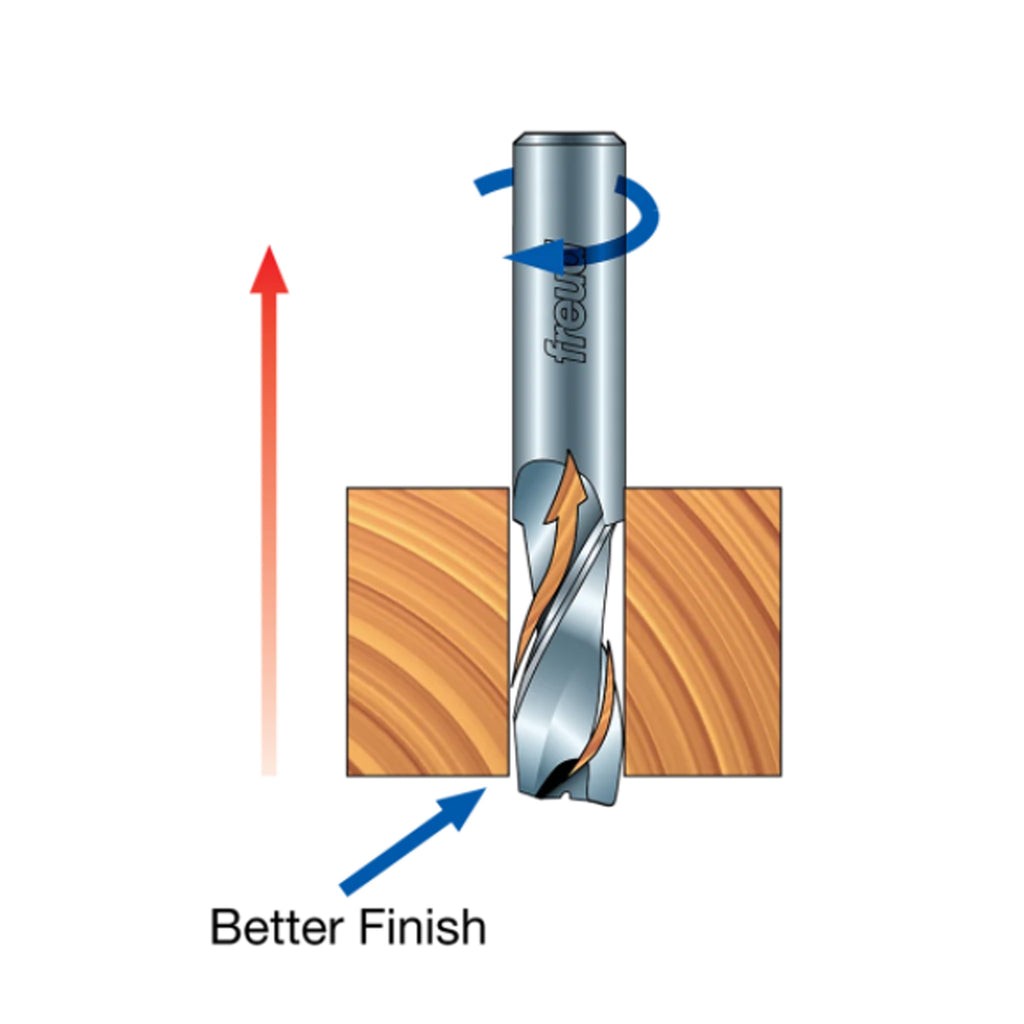 La conception en spirale vers le haut offre la meilleure qualité de coupe sur la surface inférieure du matériau.