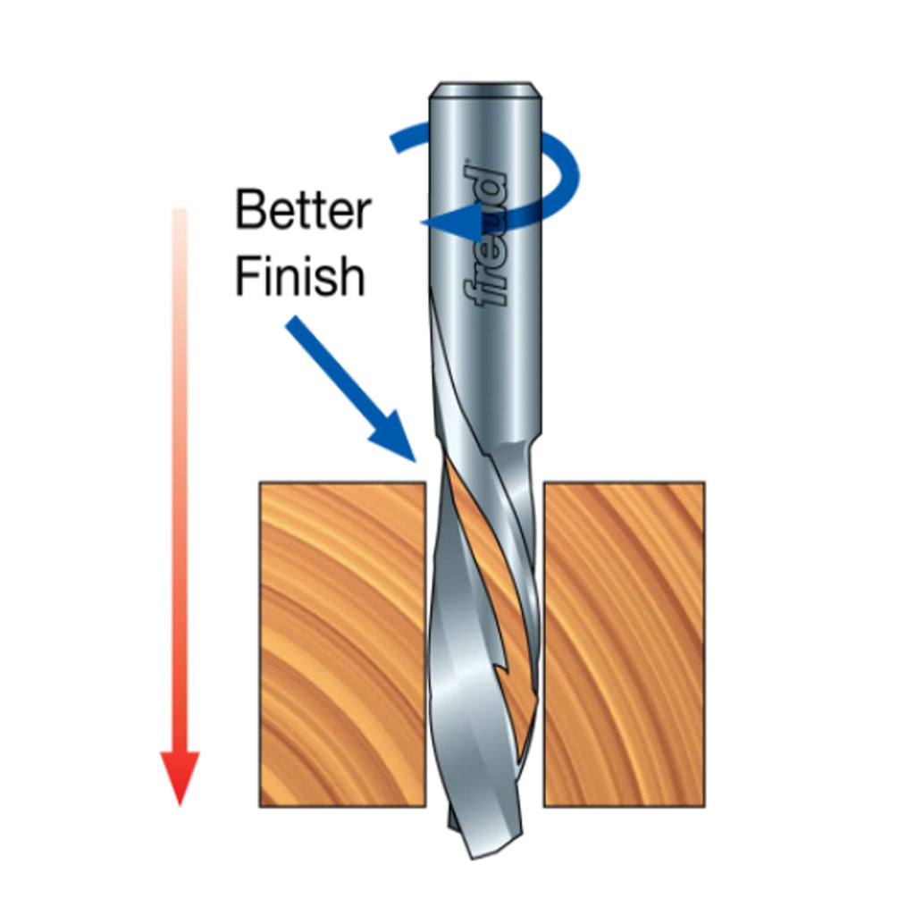 Les mèches en spirale descendante sont un excellent choix pour les rainures et les rainures dans les placages et stratifiés simple face où l'élimination des copeaux n'est pas un problème, ou pour les coupes traversantes où la qualité de finition sur la surface supérieure est la principale considération.