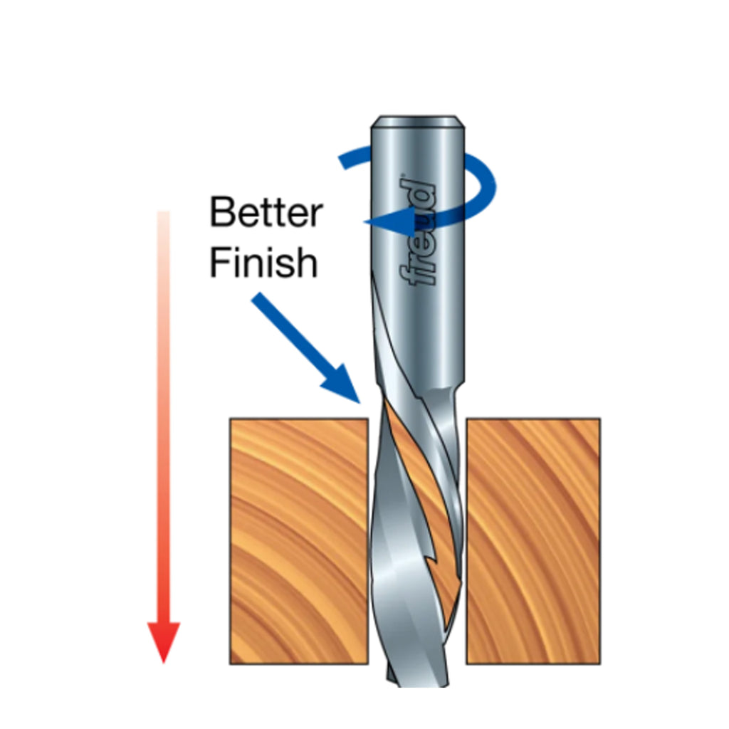 Les mèches en spirale descendante sont un excellent choix pour les rainures et les rainures dans les placages et stratifiés simple face où l'élimination des copeaux n'est pas un problème, ou pour les coupes traversantes où la qualité de finition sur la surface supérieure est la principale considération.