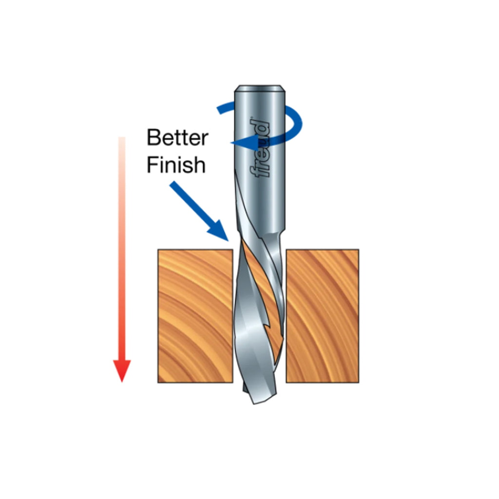 Les mèches en spirale descendante sont un excellent choix pour les rainures et les rainures dans les placages et stratifiés simple face où l'élimination des copeaux n'est pas un problème, ou pour les coupes traversantes où la qualité de finition sur la surface supérieure est la principale considération.