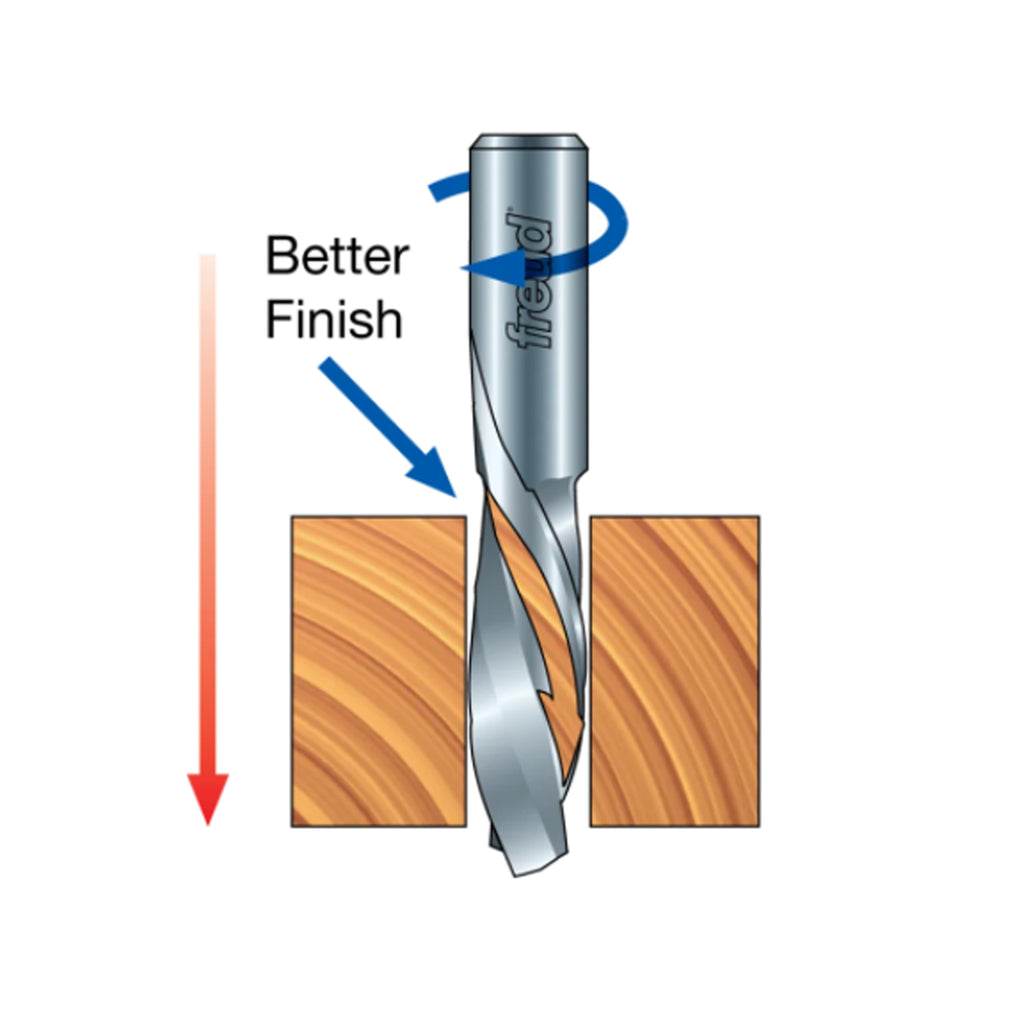 Les mèches en spirale descendante sont un excellent choix pour les rainures et les rainures dans les placages et stratifiés simple face où l'élimination des copeaux n'est pas un problème, ou pour les coupes traversantes où la qualité de finition sur la surface supérieure est la principale considération.