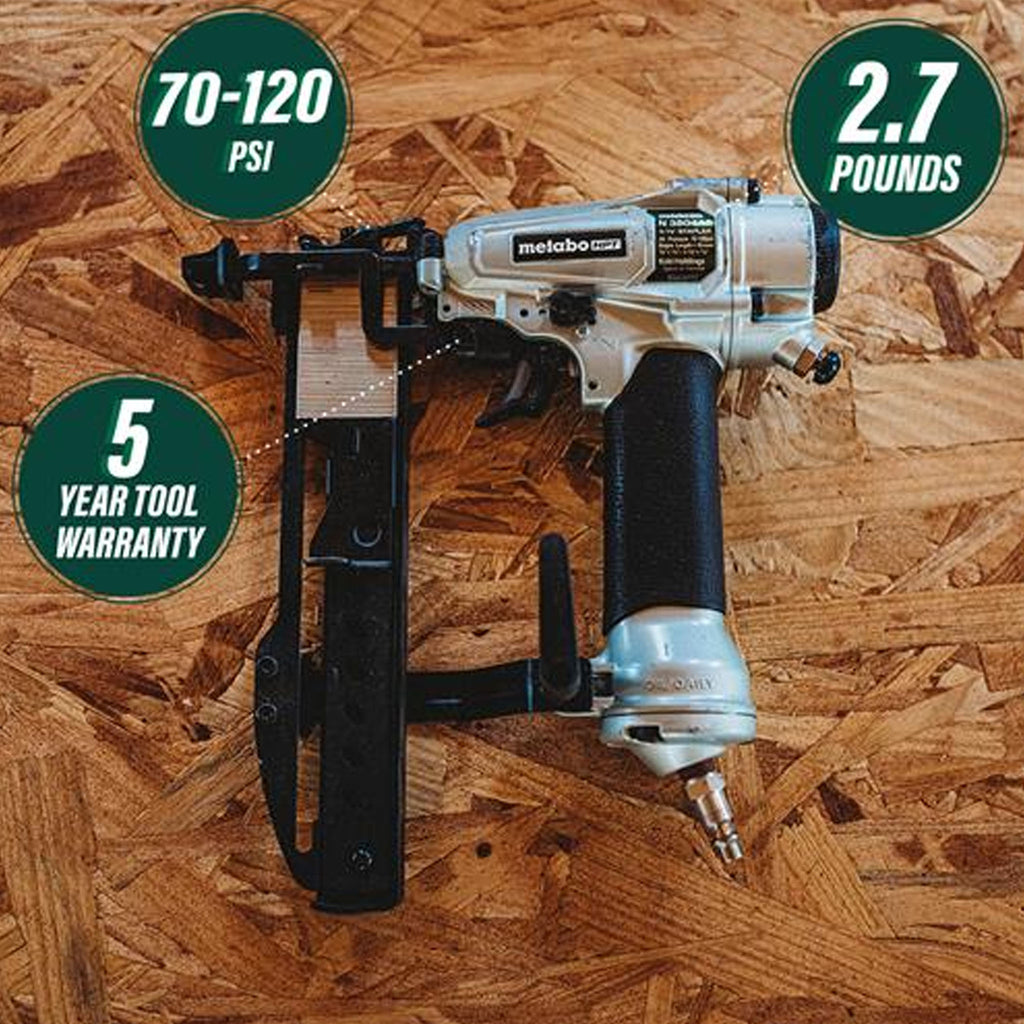 L' agrafeuse de finition PRO à couronne étroite calibre 18 ( N3804A5) a été conçue pour les menuisiers professionnels et les installations industrielles. Elle peut enfoncer des agrafes à couronne de calibre 18 de 6,35 mm (1/4 po) de longueur comprise entre 12,7 mm (1/2 po) et 38,1 mm (1-1/2 po).