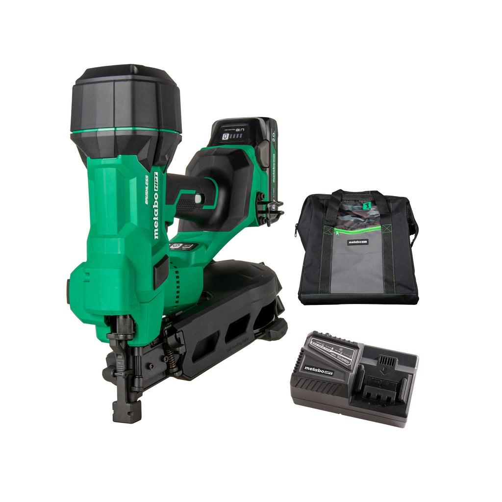La marque de cloueuses pneumatiques préférée des professionnels présente la cloueuse à bobine sans fil pour toiture, la NV1845DA . Il s'agit de la première cloueuse à bobine sans fil pour toiture à ressort pneumatique de Metabo HPT offrant la performance et la commodité exigées par les professionnels. Notre cloueuse pneumatique pour toiture domine les chantiers depuis des années et est désormais mobile. Avec la NV1845DA, vous pouvez effectuer des réparations de toiture et des petits travaux de toiture (comme la pose de faîtières, de corniches et de pignons) sans avoir à sortir un tuyau et un compresseur pour remplacer quelques bardeaux. Installez facilement des fenêtres en vinyle ou installez l'adaptateur pour bardage en vinyle inclus et réglez rapidement la profondeur pour la pose de bardage en vinyle.