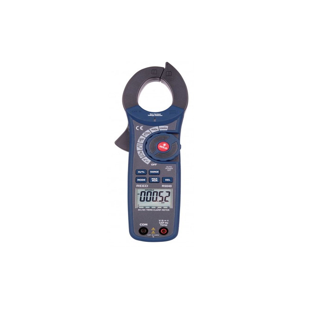 Cette pince ampèremétrique v.e.v. compacte à selection automatique est capable de mesurer courant c.a./c.c., tension, résistance, fréquence, capacité, rapport cyclique et température. Avec un affichage ACL à 50 000 comptes avec rétroéclairage avec un graphique à barres analogique à 61 segments et un boîtier en plastique double moulé, le R5040 garde une trace de l'indication min/max et a un détecteur de tension sans contact intégré à la pointe de la pince.