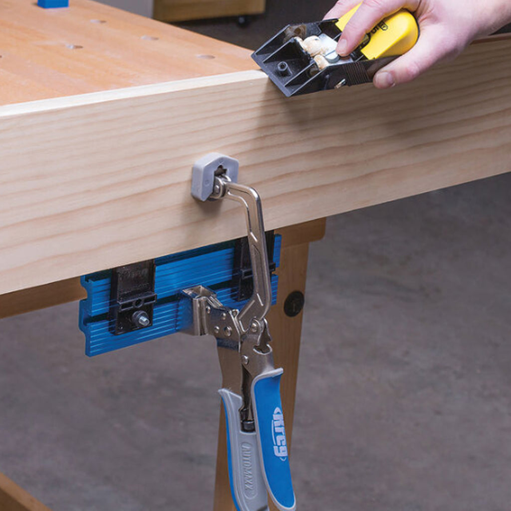 - La pince combine une pince de banc de 3'' avec une plaque en aluminium anodisé qui se monte sur le bord d’une paillasse pour créer un étau de banc simple et très efficace. Il est idéal pour serrer des pièces sur le bord, soutenu par des blocs de pince réglables, et pour tenir de grandes pièces sur le dessus d’un banc comme un étau d’extrémité traditionnel à l’aide d’une paire de chiens de banc inclus