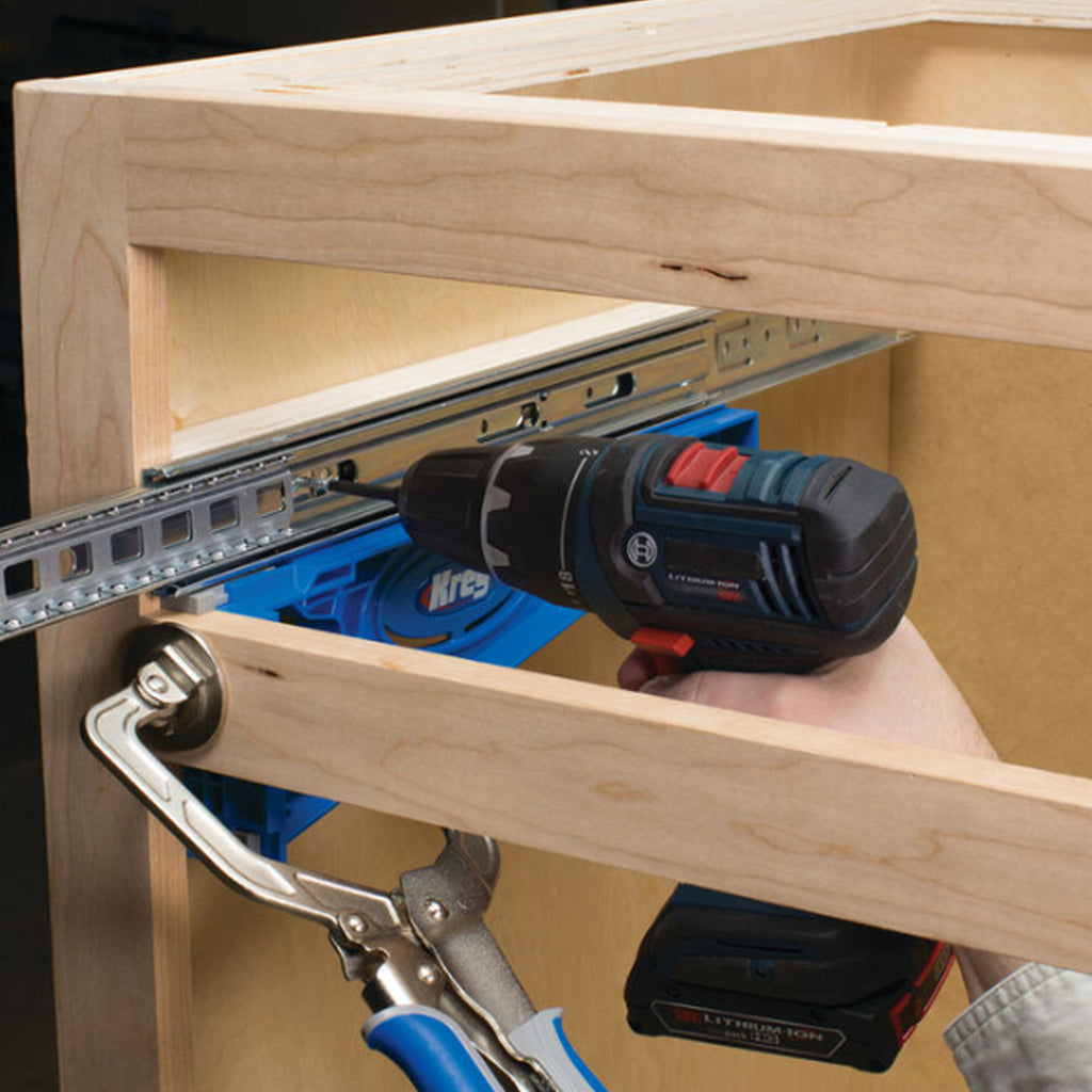 Une façon simple, précise et uniforme d'installer des glissières de tiroir. Permet d'aligner les glissières de tiroir et de les maintenir en place à l'intérieur de l'armoire pendant l'installation facilement. Permet de soutenir le tiroir en toute confiance pendant que vous fixez les glissières de façon à obtenir un alignement parfait. Relève facilement l'emplacement du gabarit par rapport à l'armoire grâce aux languettes intégrées qui permettent un positionnement infaillible. S'utilise facilement avec des armoires à cardre ou sans cadre. Permet de réaliser des tiroirs qui s,ajustent et glissent à la perfection. Garantit chaque fois un positionnement précis des glissières. Permet d'obtenir des résultats fiables et uniformes. Élimine le travail à l'aveuglette. Compatible avec glissières à roulement, à bille, à montage sous plan et à revêtement à l'époxy.