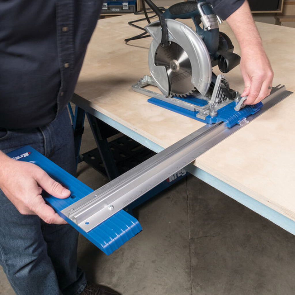 Transformez votre scie circulaire en un outil de coupe de précision avec guide de rebord! Les projets de qualités commencent par des coupes de grande qualité et vous êtes en mesure de faire ces coupes plus facilement que vous ne l’auriez pensé en utilisant le guide de rebord pour scie circulaire Rip-Cut avec votre scie circulaire. Le Rip-Cut™ de Kreg transforme votre scie circulaire en un guide de rebord pour des coupes droites, précises et de même mesure à chaque coupe, dans le contreplaqué, le MDF ou autre grande feuille. Avec le Rip-Cut, vous pouvez couper avec confiance et avec la précision dont vous avez besoin. Il permet d'‘exécuter facilement des coupes droites, précises et ce, malgré le nombre de répétitions à faire. Le Rip-Cut fonctionne avec un long guide de rebord qui suit le bord droit de la feuille que vous coupez. Donc, tout ce que vous avez à faire est de verrouiller votre scie à la mesure désirée jusqu’à 24’’en utilisant l’échelle de mesure intégrée et puis faire votre coupe. Avec l’échelle de mesure intégrée, vous n’avez pas besoin de mesurer ni de marquer chaque coupe. Vous n’avez qu’à verrouiller votre scie à la mesure désirée et vous êtes prêt pour la coupe, peu importe le nombre que vous avez à faire. Il rend la tâche plus facile lorsqu’il est temps de couper de grandes feuilles.