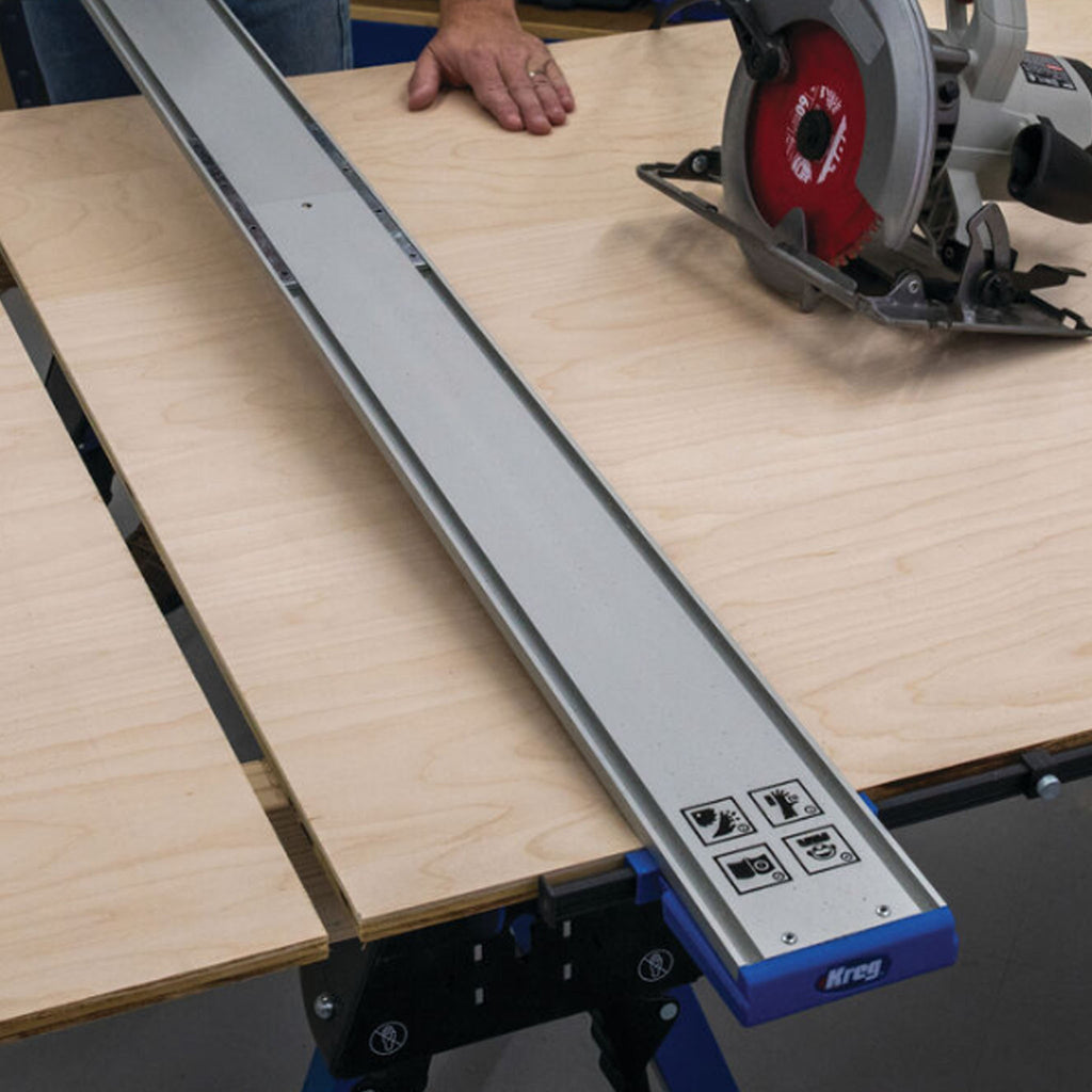 Le Guide bord offre un moyen intuitif et accessible de décomposer les feuilles. Votre scie roule contre le guide en aluminium, vous permettant d'effectuer des coupes droites et précises. La découpe guidée vous permet de voir plus facilement que jamais ou vous allez couper afin d'obtenir les résultats que vous attendez.