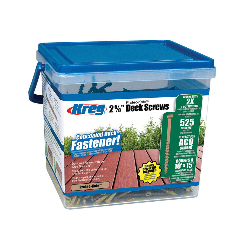 Ces vis haute-qualités pour terrasse Kreg sont spécialement conçues pour être utilisées avec un Kreg Deck Jig. Ces vis peuvent aussi être utilisées de manière générale comme des vis normales dans une panoplie de projets extérieurs. La technologie Protec-Kote™ est caractérisé par 3 couches anti-corrosion combiné chimiquement pour procurer une solide protection contre la rouille et la corrosion dans de nombreuses applications extérieures communes. Parfait pour le bois d'œuvre traité à l'ACQ. Note: Utiliser le Kreg Deck Jig avec des matériaux 2x et plus épais requiert des instructions spéciales. Cliquez ICI pour y accéder. (Disponible en anglais seulement) Embout carré KTX pour une solide insertion du tournevis Protec-Kote™ fournit une solide protection contre les éléments extérieurs Acier crémenté qui signifie aucune courbure ni rupture Pointe autotaraudeuse pour un vissage facile et rapide Couleur neutre qui s'agence à la plupart des terrasses 2 5/8'' (66.675mm) de long, spécifiquement conçu pour des matériaux de terrasses épais (1 1/2''/38.1 mm d'épais)
