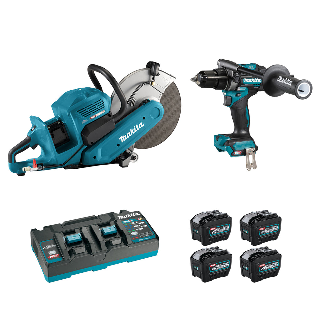 Quatre Batterie BL4080F li-ion 40 V Max (8,0 Ah) (BL4080F), chargeur Rapide double port (DC40RB), meule à tronçonner 14 po (E-12809-5), manchon de raccordement (123120-4), boyau (122B46-9), clé polygonale 13-19 (782037-6), jeu de bagues (191W53-9), Perceuse HP001GZ