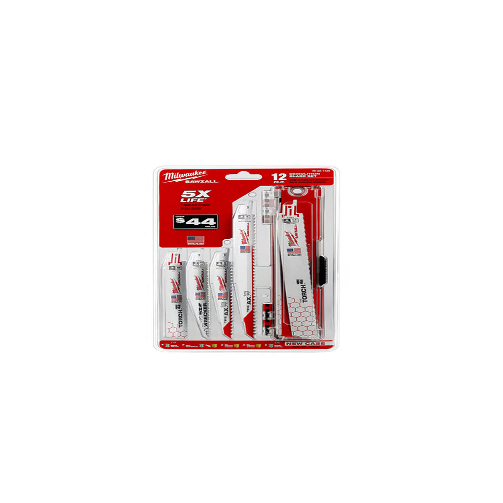 Notre ensemble de 12 lames de démolition SAWZALL® comprend un assortiment de nos lames de démolition les plus populaires pour un large éventail d'applications professionnelles. Les lames de démolition MILWAUKEE® SAWZALL® sont plus épaisses pour une durabilité maximale et plus hautes pour des coupes plus droites. Cet ensemble comprend l'AX™ pour couper le bois clouté, le Wrecker™ pour vos travaux de démolition généraux et le Torch™ pour couper le métal. Un étui de rangement réglable et durable est inclus, pouvant contenir des lames jusqu'à 23 cm.