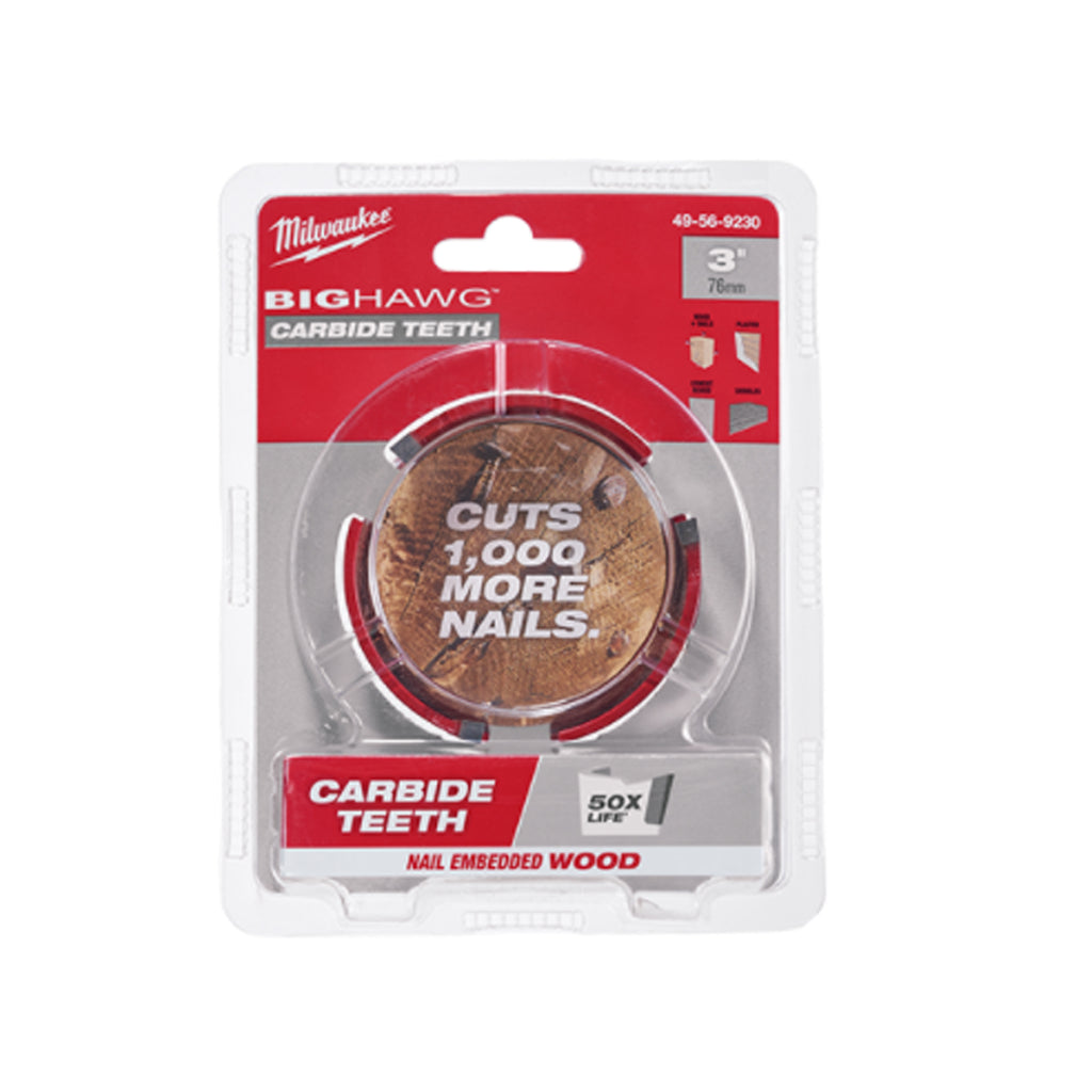 Le MILWAUKEE® BIG HAWG ™ avec dents en carbure est la meilleure solution de scie cloche pour les applications de bois incrustés de clous et de matériaux abrasifs. Notre scie cloche, première sur le marché, offre une durée de vie extrême grâce à la technologie avancée du carbure. Le BIG HAWG ™ donne aux utilisateurs 50 fois plus de vie dans des applications exigeantes avec la possibilité de couper plus de 1000 clous. La scie cloche robuste a des dents en carbure 10X plus grandes qui déchirent les matériaux cinq fois plus rapidement. Des fentes plus profondes permettent un retrait rapide et facile de la fiche. Notre scie cloche BIG HAWG ™ est la meilleure solution pour couper les matériaux les plus résistants, notamment les clous, les panneaux de ciment, les bardeaux, le plâtre et le stuc.