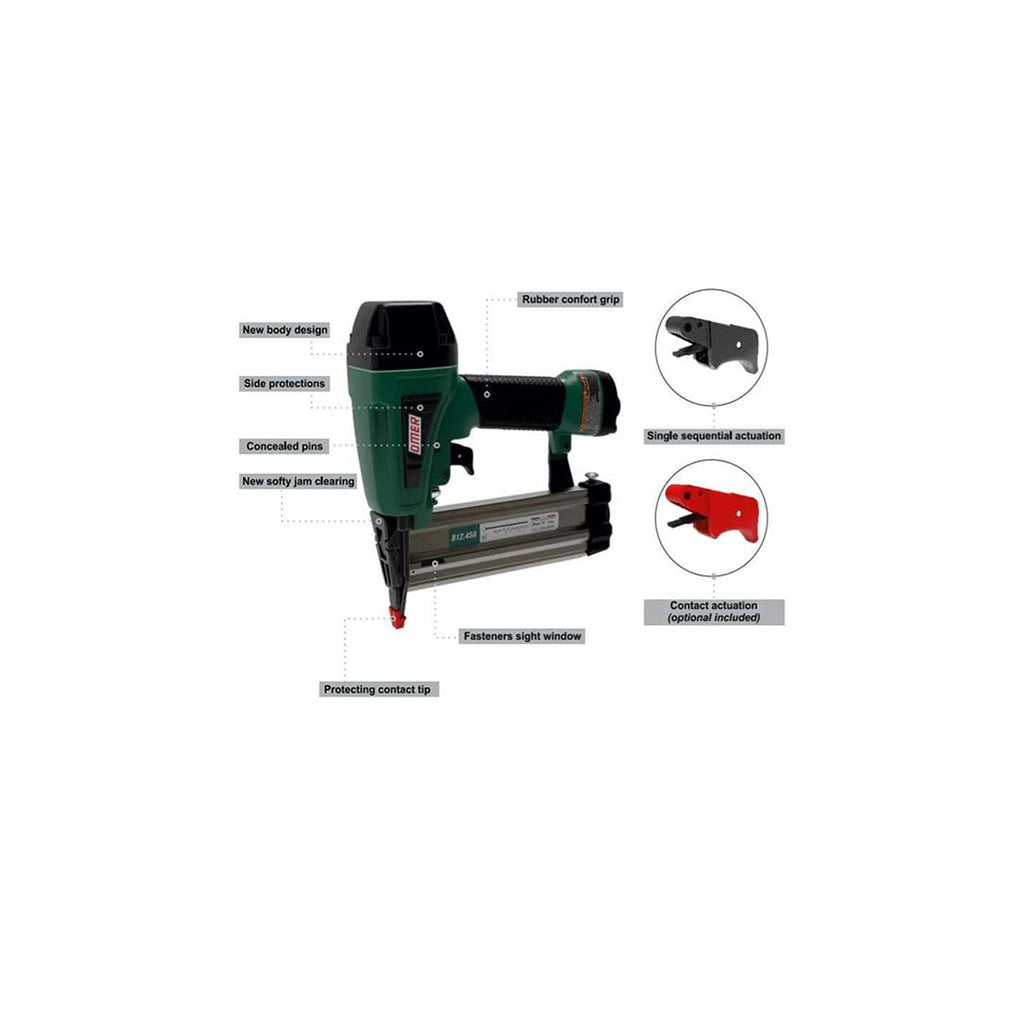 La cloueuse Omer B12.450 de calibre 18 est une version mise à jour du bien connu 12.50. Les fonctionnalités mises à jour incluent un nouveau système de déclenchement plutôt que l'interrupteur d'incendie à déclenchement/déclenchement (qui causait des problèmes avec certaines normes de sécurité), il est désormais livré avec 2 déclencheurs échangeables afin que vous puissiez le régler rapidement sur celui que vous souhaitez (évite également les cassures courantes). hors de cet interrupteur). Il est également légèrement plus ergonomique, dispose d'un mécanisme d'élimination des bourrages plus facile à ouvrir, d'un nouveau design avant plus plat pour accéder aux coins les plus étroits, et bien plus encore.