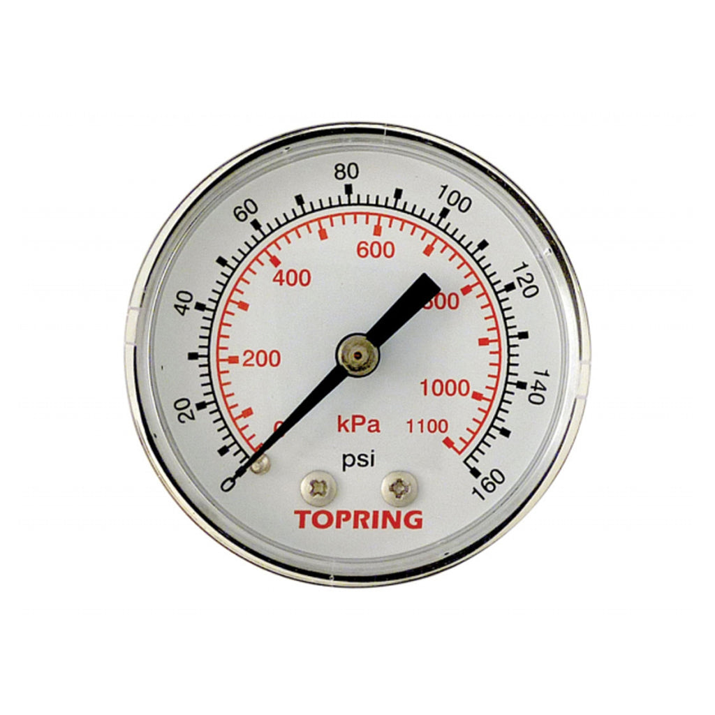 • Diamètre: 2 po • CBM: 1/4 NPT • Gamme de pression : 0-160 PSI • Graduation à double échelle en PSI (noir) et en kPa (rouge) • Température d’utilisation : -18 à 60 °C • Précision : ± 2,5 % pleine échelle Matériau(x) : • Boîtier : Acier peint (noir) • Lentille : Acrylique • Tube de bourdon : Bronze phosphoreux • Mouvement : Surface en laiton poli et nylon • Raccord : Laiton