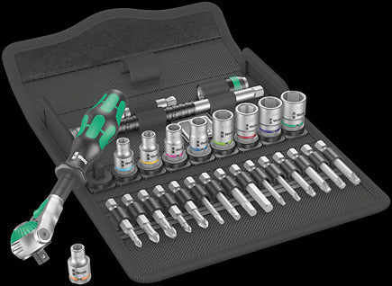 Agencement incroyablement compact, permettant de loger un grand nombre d'outils dans un espace réduit. Les housses textiles d'un genre inédit permettent de ré-appréhender totalement le concept d'''assortiment cliquet'' et offrent une robustesse et une longévité remarquables. Positionnable debout pour un stockage bien ordonné sur l'étagère à outils. Protection accrue des surfaces grâce au matériau extérieur textile. Faible encombrement et poids réduit, pour un net gain de mobilité. Avec repéreur d'outil ''Take it easy'' : identification des calibres par couleur.
